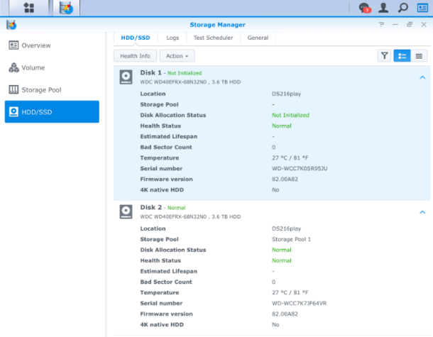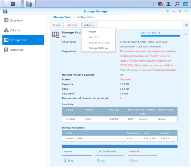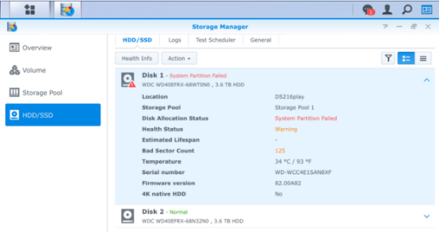 Dado que tienes un sistema RAID 1 (o en SHR, si usas un Synology) no debes preocuparte más allá de lo necesario; tener uno de los discos degradado no implica que no puedas seguir usando tu NAS, pero no puedes permitirte otro fallo. Debemos proceder a reemplazar el disco dañado cuanto antes. Recuerda que el disco nuevo DEBE tener al menos la misma capacidad, o de lo contrario no se podrá reconstruir el espejo.