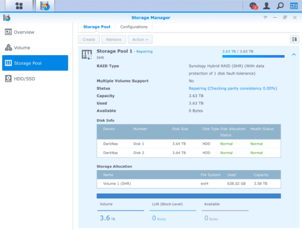 Dale tiempo ahora al NAS para que vuelva a dejar operativo el RAID 1 con el nuevo disco. En mi caso, un disco de 4TB al 30% de ocupación ha requerido 5 horas y 49 minutos para que se realizase nuevamente el espejo.