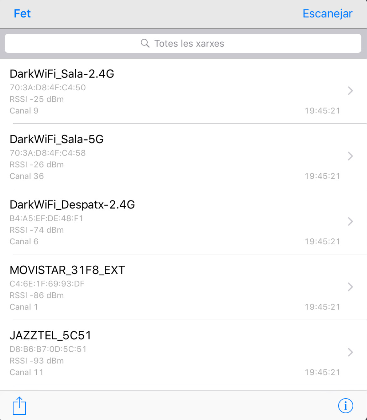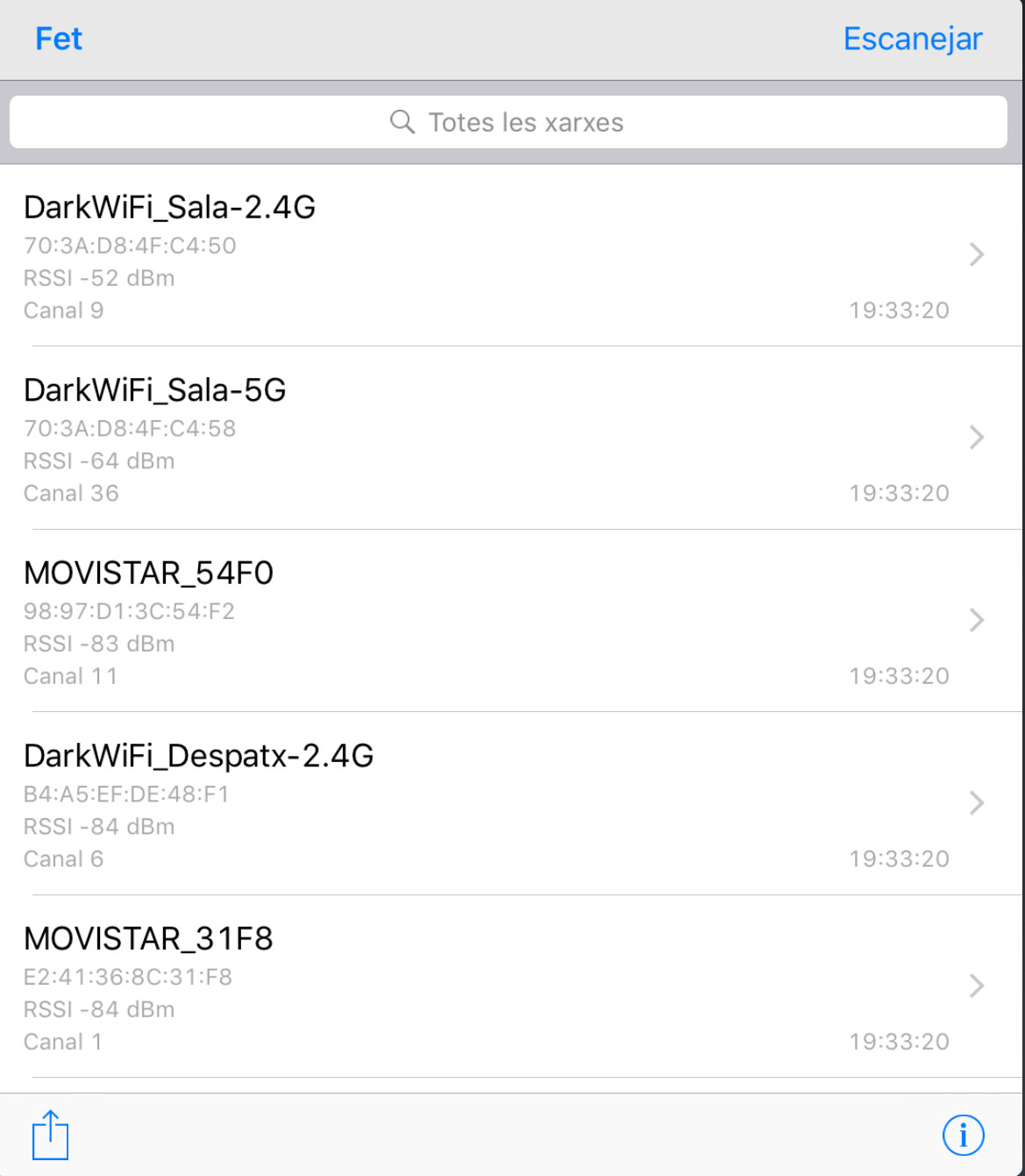 Fíjate en lo que ocurre cuando estoy en la planta superior de mi casa -segunda imagen-, con el router ubicado en la planta inferior, con respecto a cuando me haya junto a él -primera imagen-. Claramente la WiFi ac (DarkWiFi_Sala-5G) presenta una atenuación mayor que la WiFi n (DarkWiFi_Sala-2.4G). El valor se mide en dBm: