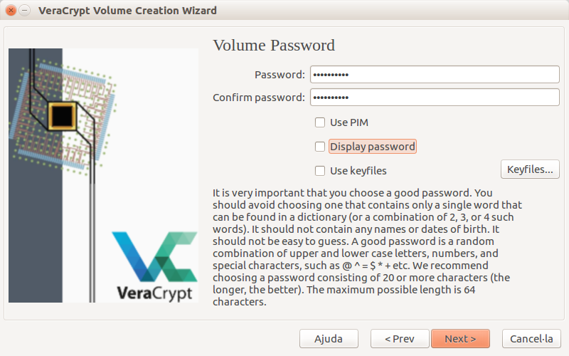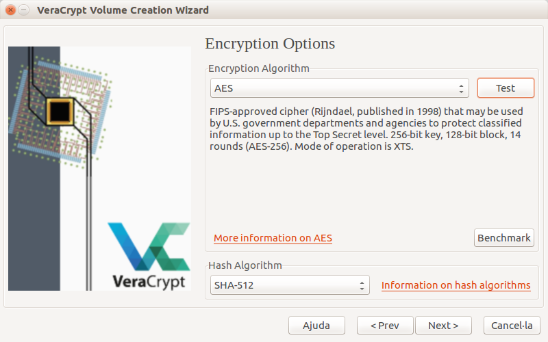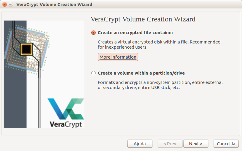 - Pulsa sobre el botón Create Volume y seleciona la opción de crear un contenedor cifrado