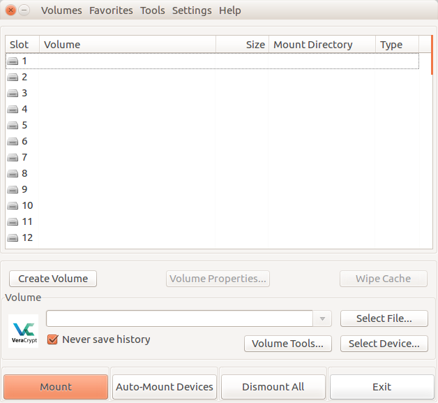 1 2 3 | sudo add-apt-repository ppa:unit193/encryption sudo apt-get update sudo apt-get install veracrypt |