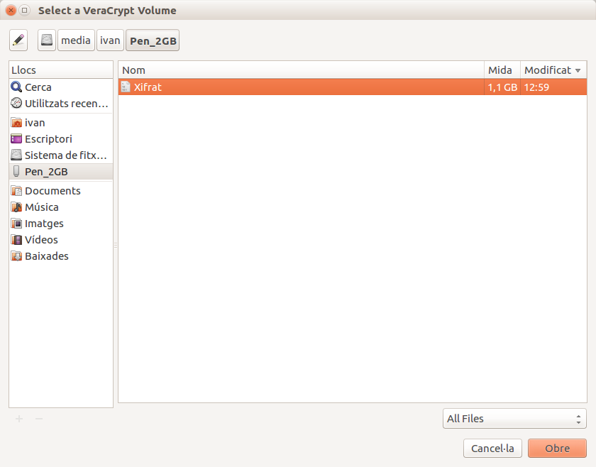 - Desde la pantalla de inicio de Veracrypt, pulsa sobre el botón Select file y selecciona el nombre del contenedor cifrado creado en el apartado anterior «Creación de un contenedor cifrado»